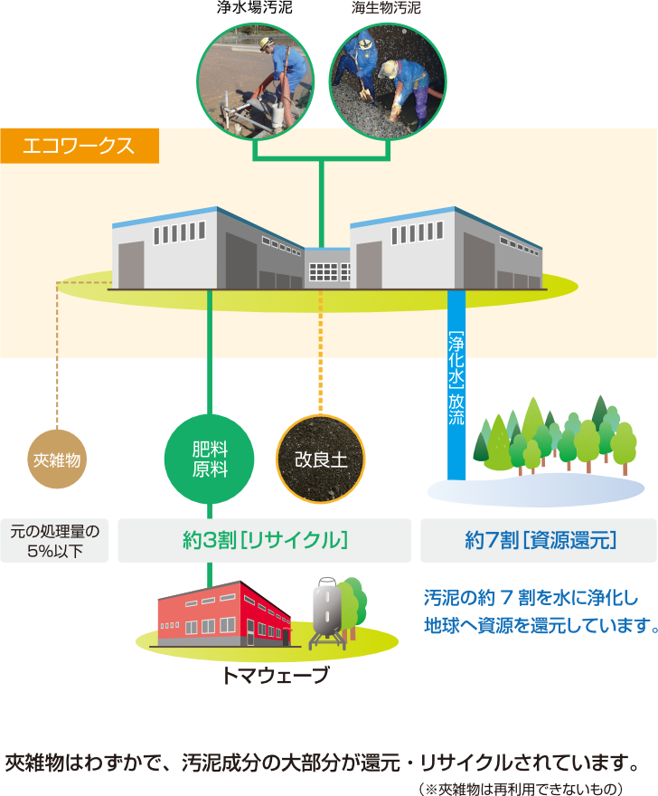 エコワークス苫小牧では、社会の中で発生・排出された汚泥の最終処理を行っています。余分なエネルギーを使ってリサイクル商品を生産するのではなく、必要最低限のエネルギーで資源の本来の姿へ戻し、私たちが住む地球へ還元する循環型社会創出の一翼を担う最後の関所が「エコワークス苫小牧」です。