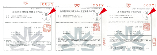 当社は平成23年8月9日に「産業廃棄物収集運搬業」、「産業廃棄物処分業」、「特別管理産業廃棄物収集運搬業」それぞれで認定を受けました。